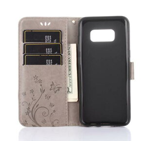 Galaxy Note8 手帳型スマホケース ストラップ付き レザー 合皮 エンボス加工 蝶 花 蔦 ツタ 蔓唐草 マグネット開閉 閉じたまま通話可能 カード収納 スタンド機能付き docomo ドコモ au SC-01K SCV37 グレー